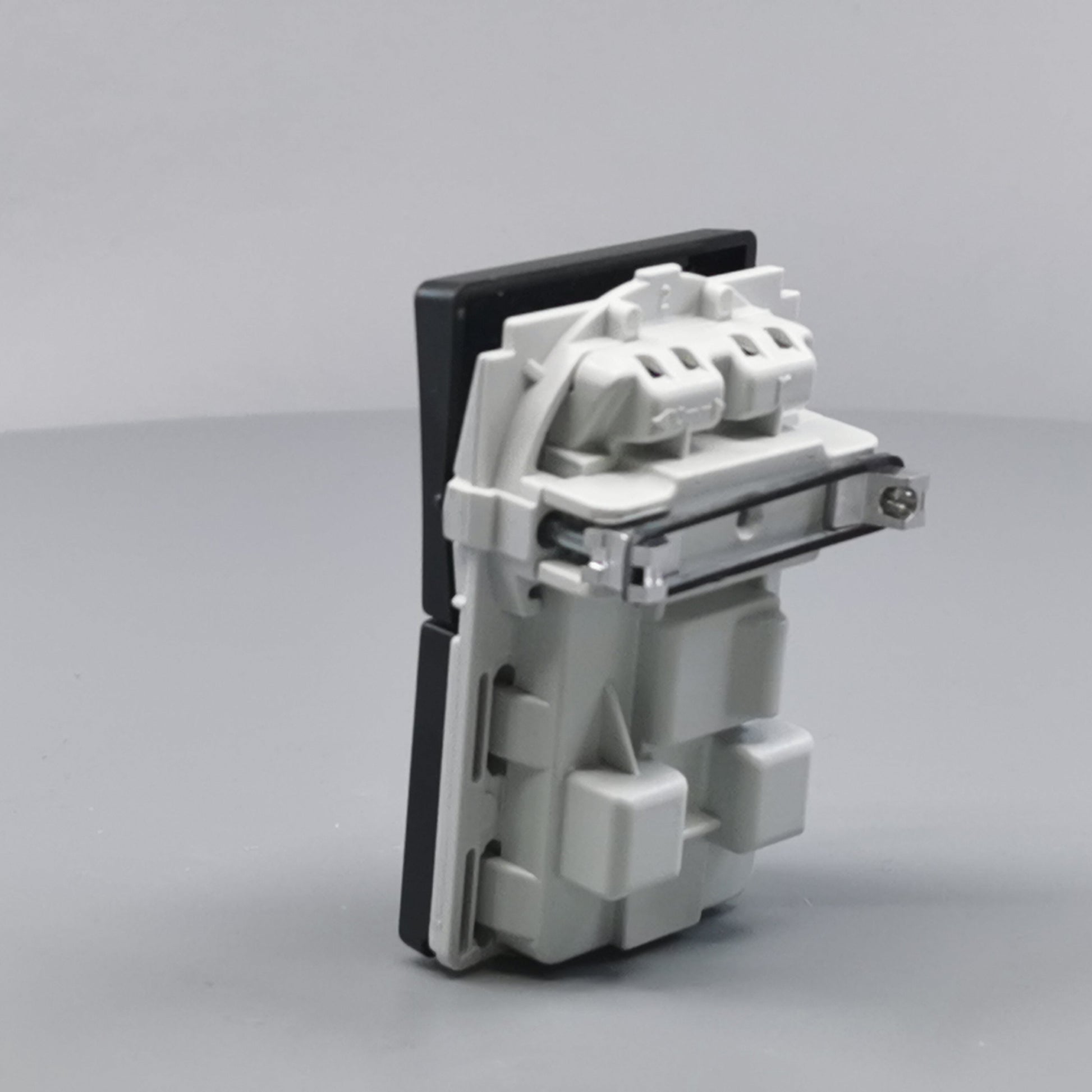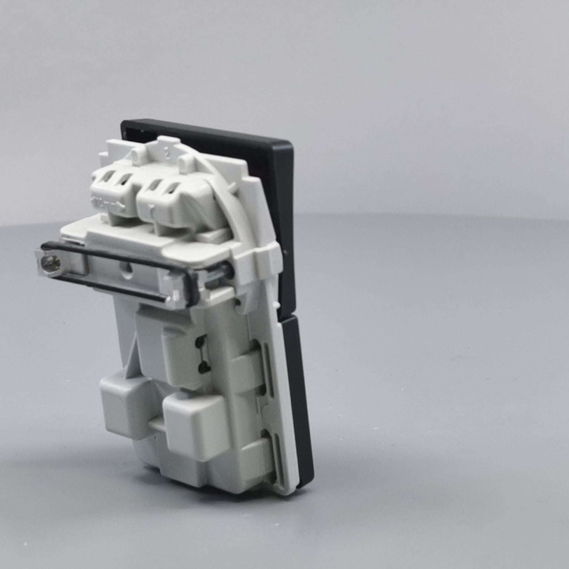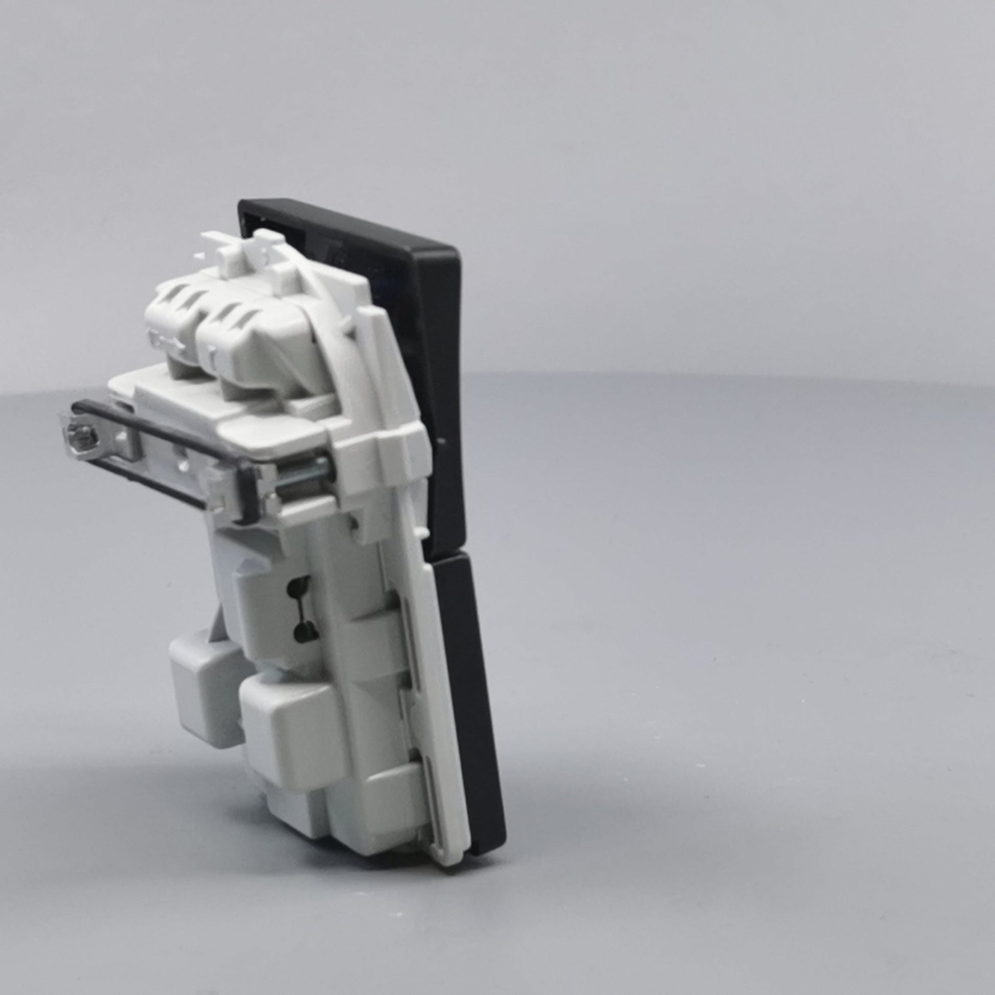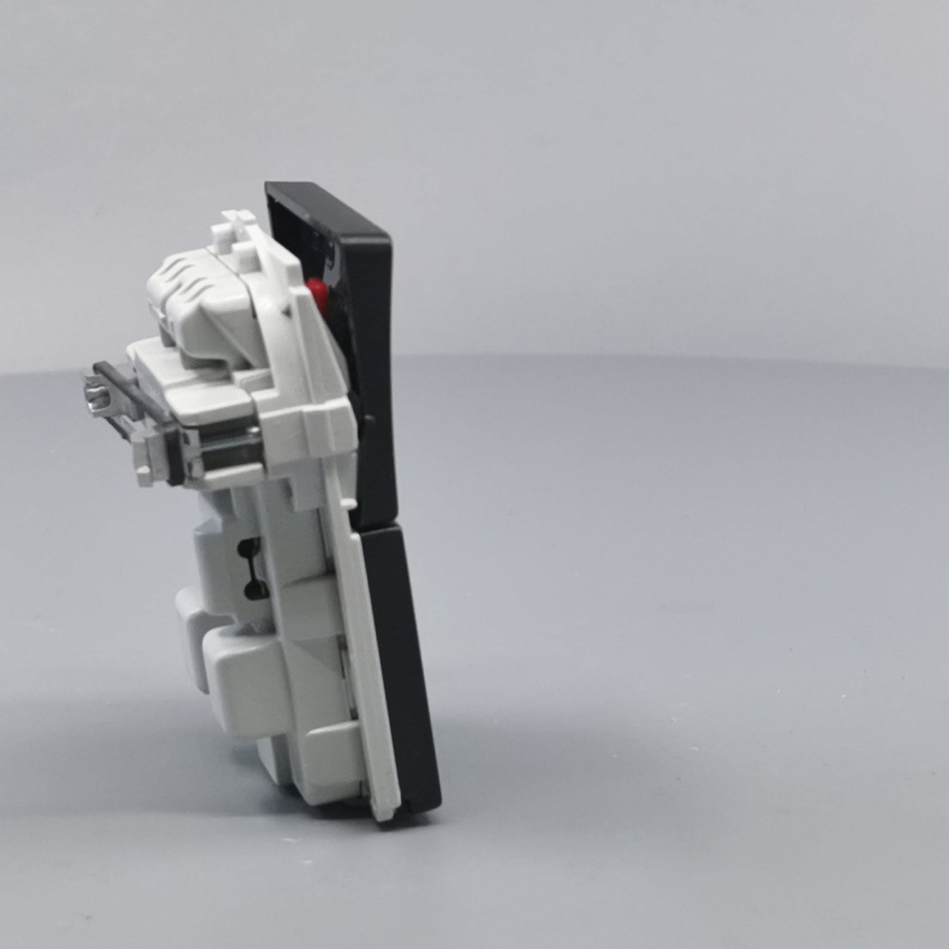 Er konstrueret med pillesikring. Stikkontakt med afbryder og lampe opbygges af indsats for stikkontakt samt tangent/afdækning med lampe. Indsatsen har skrueløse klemmer for 2 stk. 1,5- eller 2 stk. 2,5 mm² stiv ledning pr. klemme (en leder pr. hul).