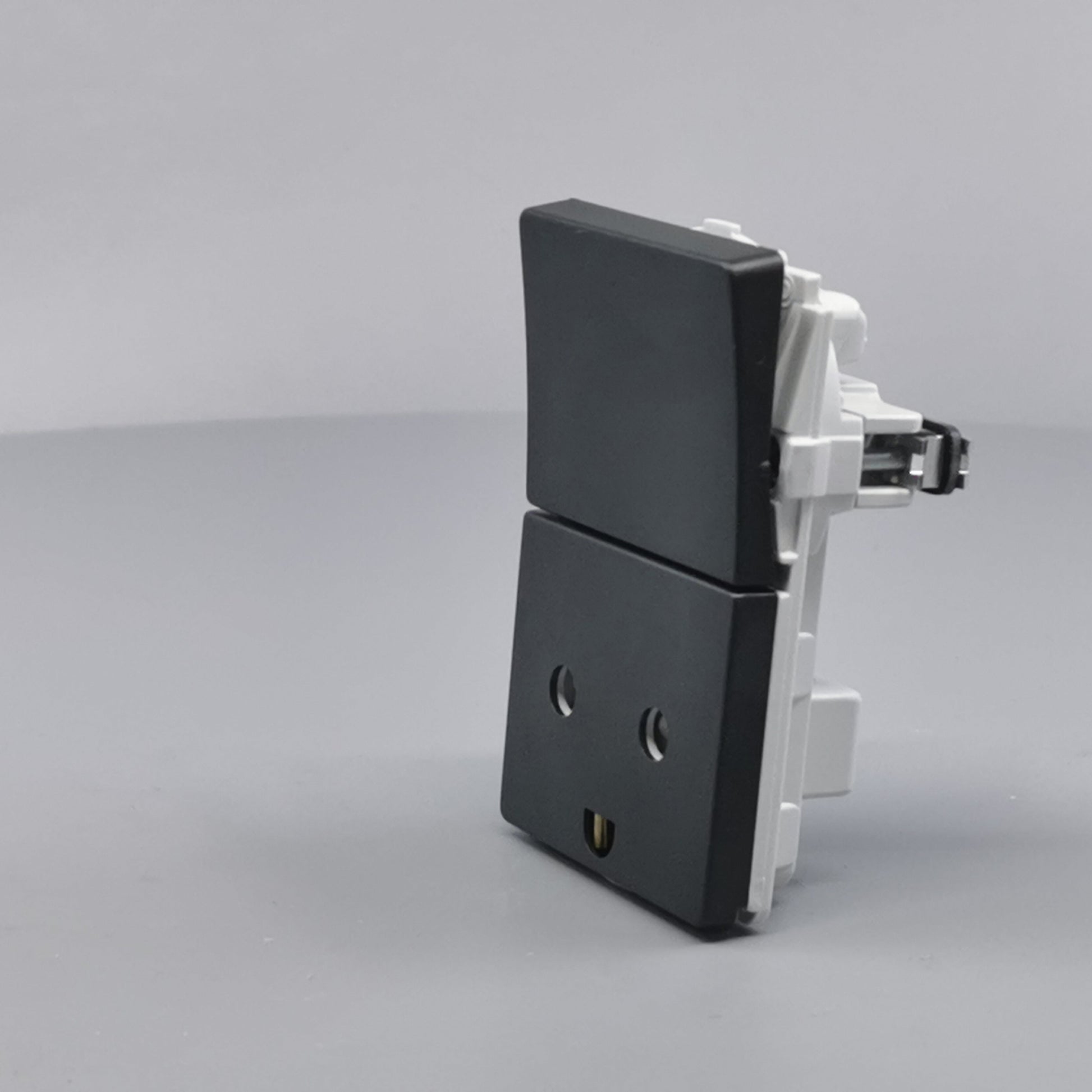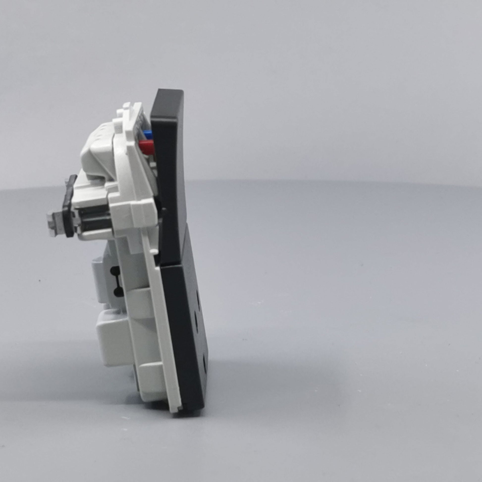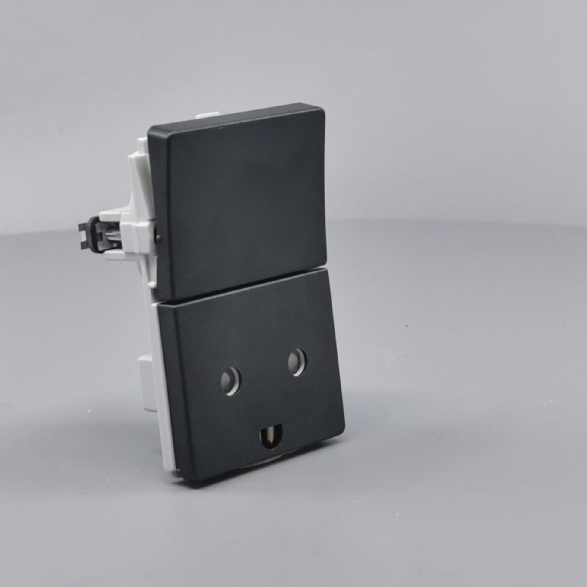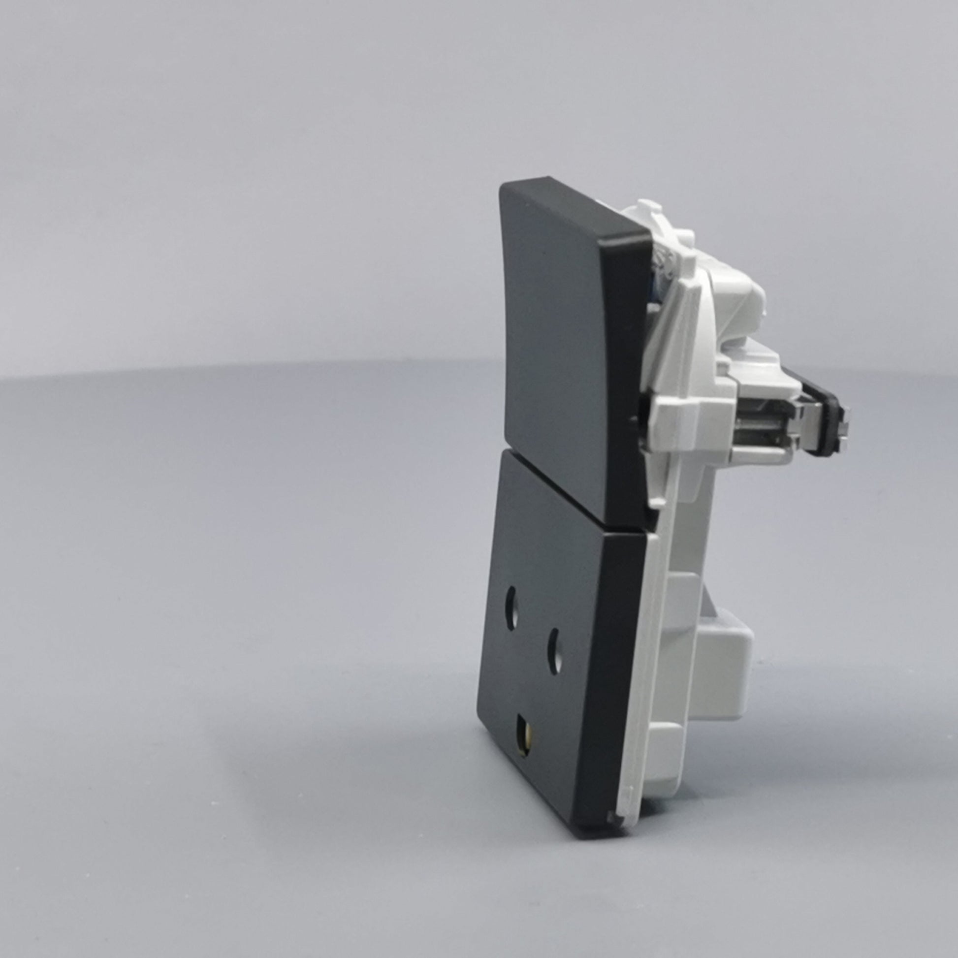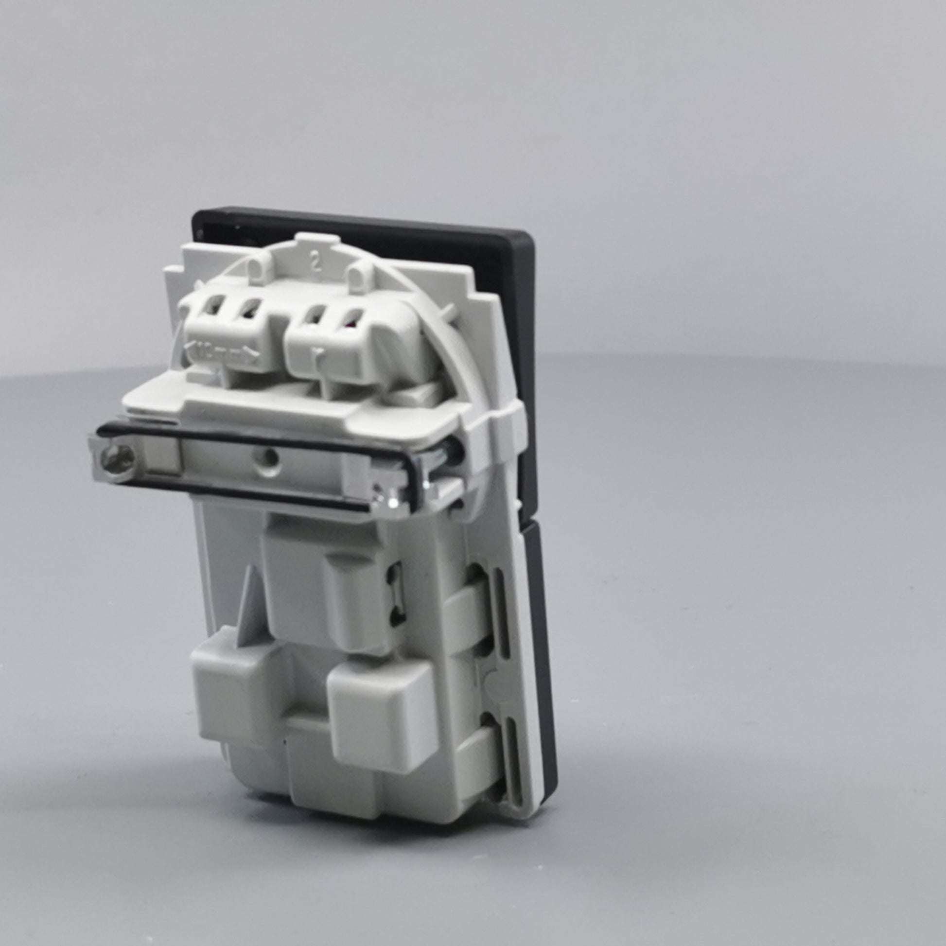 Er konstrueret med pillesikring. Stikkontakt med afbryder og lampe opbygges af indsats for stikkontakt samt tangent/afdækning med lampe. Indsatsen har skrueløse klemmer for 2 stk. 1,5- eller 2 stk. 2,5 mm² stiv ledning pr. klemme (en leder pr. hul).