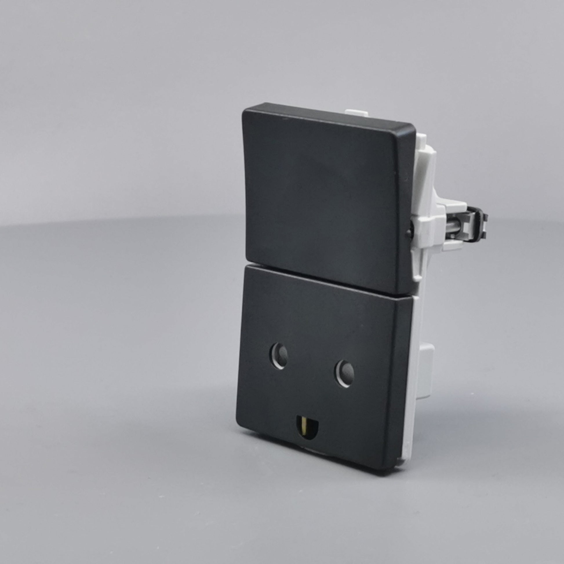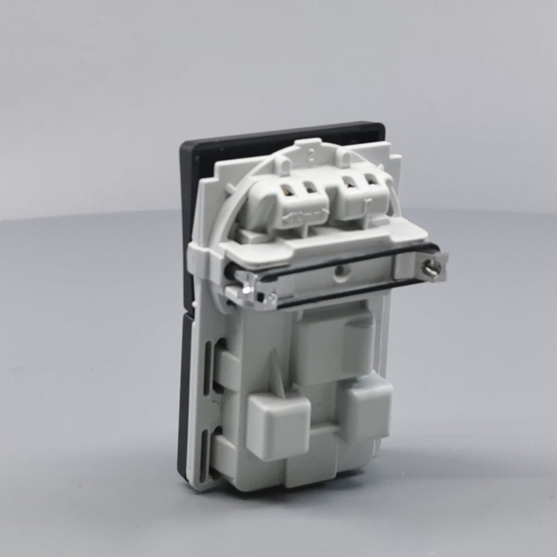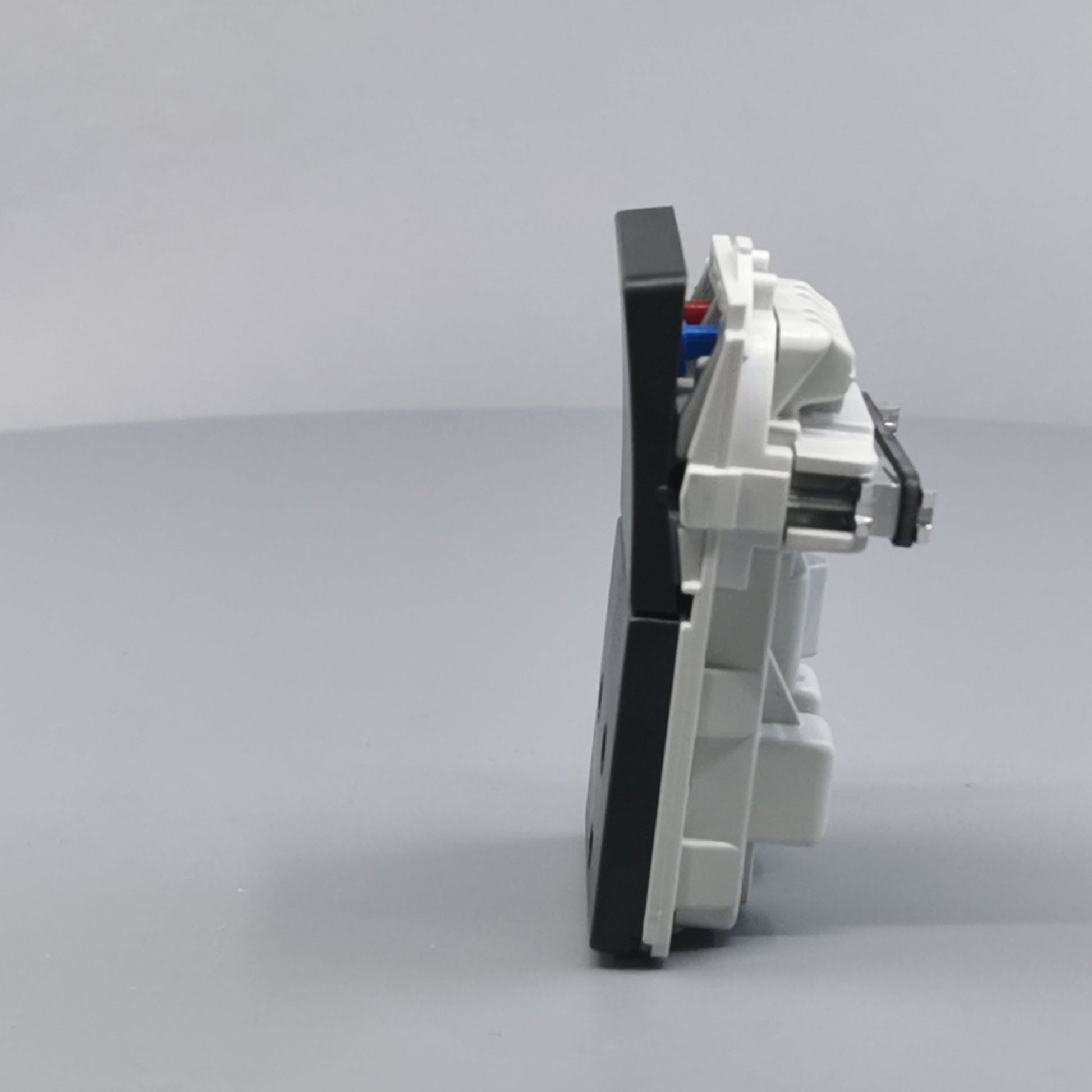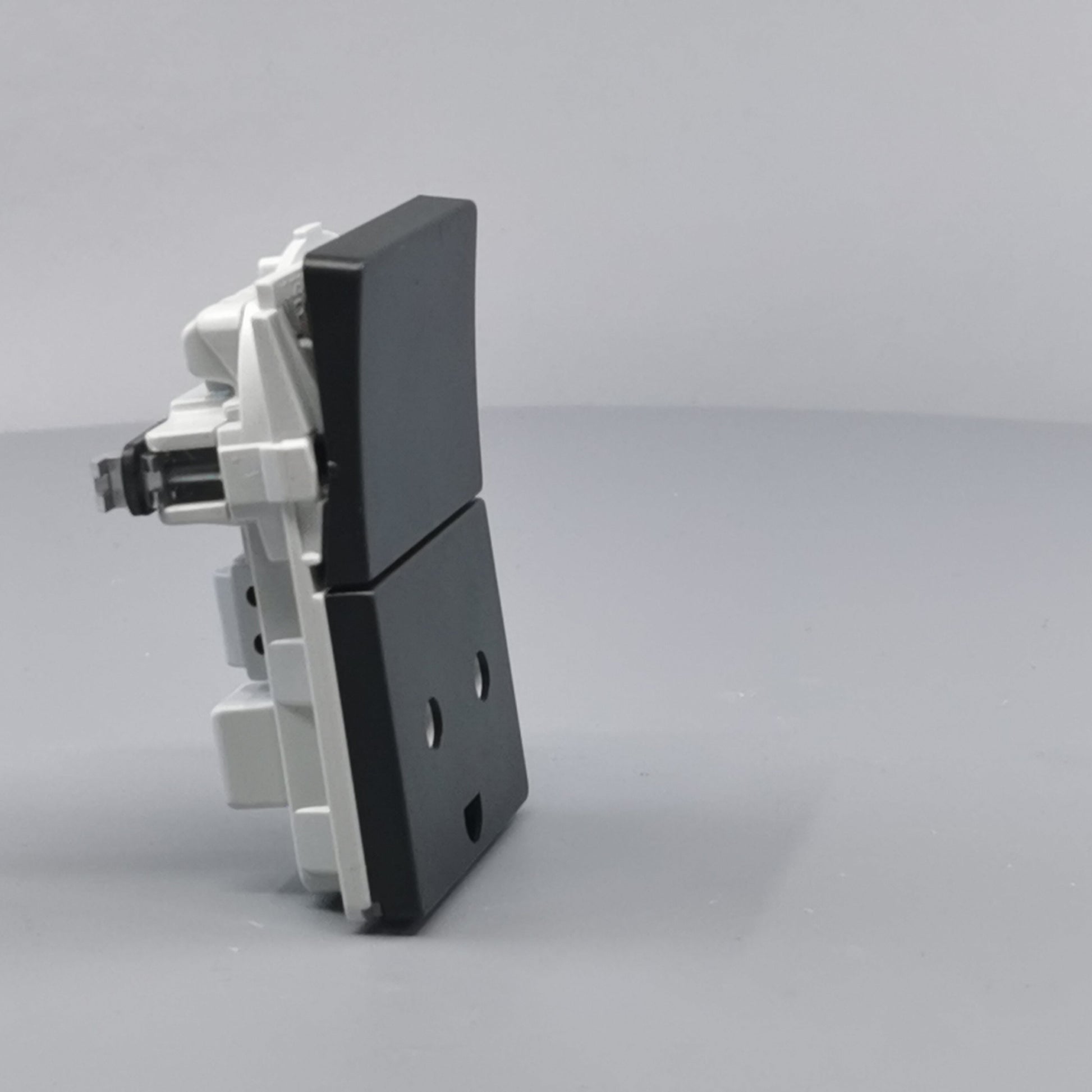 Er konstrueret med pillesikring. Stikkontakt med afbryder og lampe opbygges af indsats for stikkontakt samt tangent/afdækning med lampe. Indsatsen har skrueløse klemmer for 2 stk. 1,5- eller 2 stk. 2,5 mm² stiv ledning pr. klemme (en leder pr. hul).