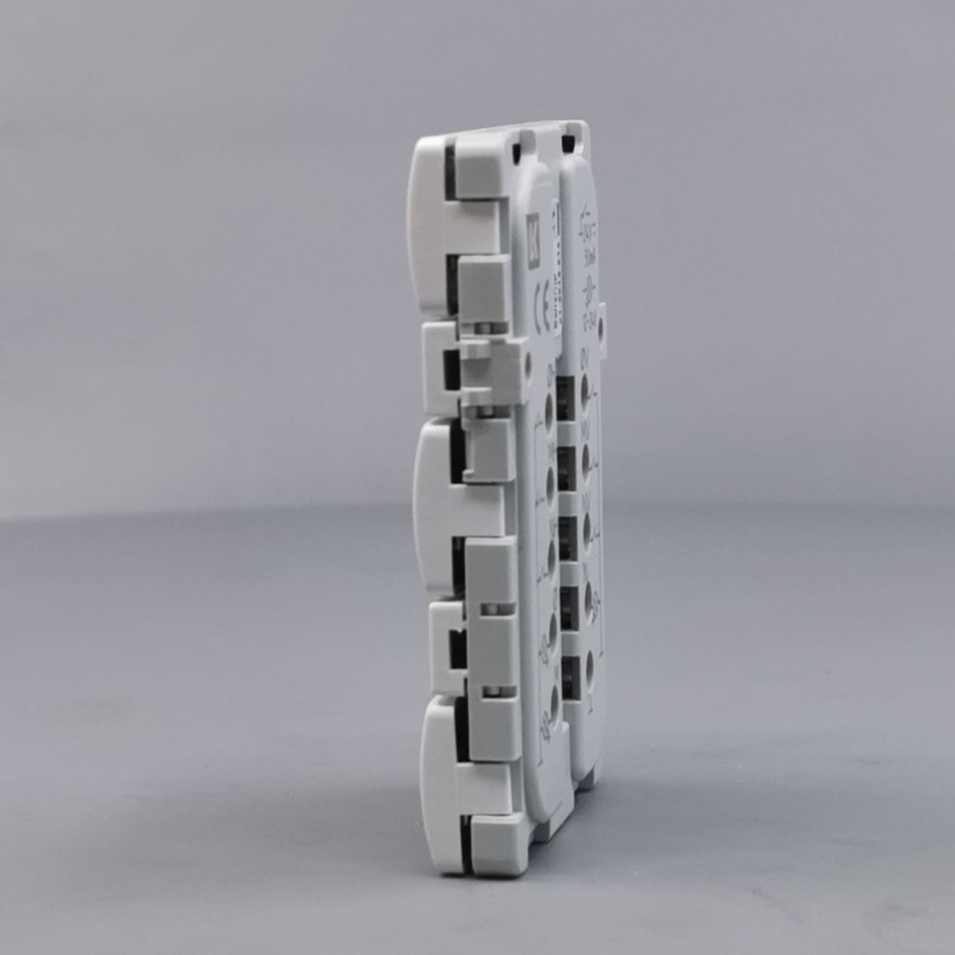 Er på bagsiden forsynet med skrueklemmer for tilslutning og sløjfning af svagstrømsledninger.