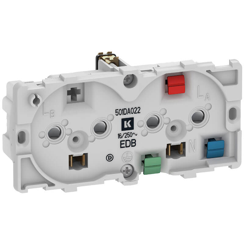 Fuga dobbelt stikkontakt EDB 2-polet med jord er designet til at forhindre uautoriseret tilslutning af enheder til et særskilt EDB-net. Denne model er ideel til både planforsænket montage i indmuringsdåser og til isætning forfra i lette skillevægge samt på forskellige underlag.