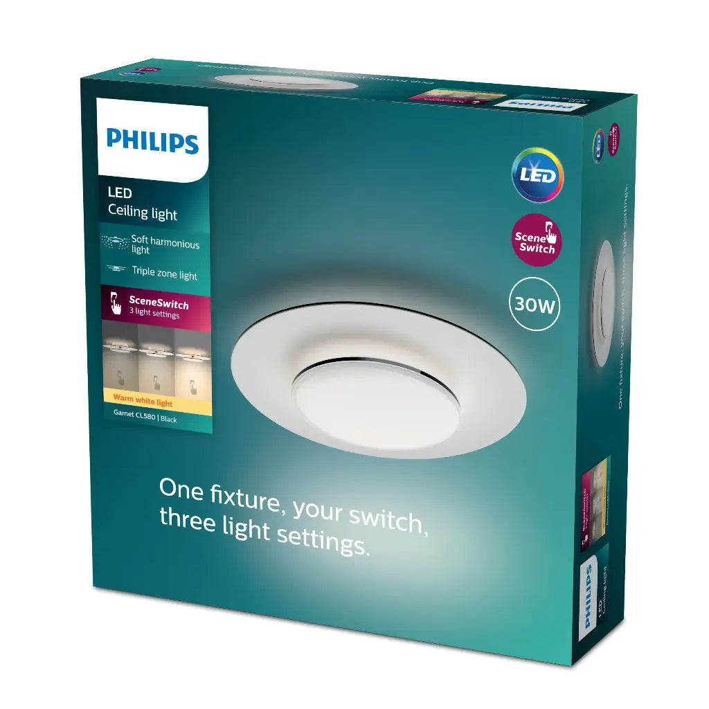 Det har aldrig været nemmere at skabe den rette stemning i dit rum. Philips Garnet SceneSwitch LED loftslampen lader dig skrue op for stemningen med tre unikke indstillinger. Kombinationen af primær og indirekte belysning giver dig de perfekte værktøjer til at sætte den rette stemning til både koncentrations- og hyggestunder. Ingen lysdæmper eller installation påkrævet. Det eneste, du skal bruge, er din eksisterende kontakt. Farve Black Material Plastic Volt 220-240 Ampere (mA) 154 Udskæringsstørrelse (mm) / IP klassificering IP20 Fjernbetjening No