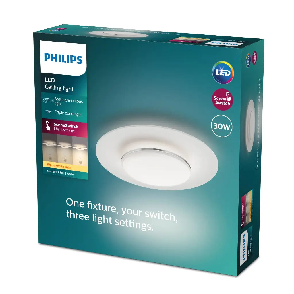 Det har aldrig været nemmere at skabe den rette stemning i dit rum. Philips Garnet SceneSwitch LED loftslampen lader dig skrue op for stemningen med tre unikke indstillinger. Kombinationen af primær og indirekte belysning giver dig de perfekte værktøjer til at sætte den rette stemning til både koncentrations- og hyggestunder. Ingen lysdæmper eller installation påkrævet. Det eneste, du skal bruge, er din eksisterende kontakt. Farve White Material Plastic Volt 220-240 Ampere (mA) 154 Udskæringsstørrelse (mm) / IP klassificering IP20 Fjernbetjening No