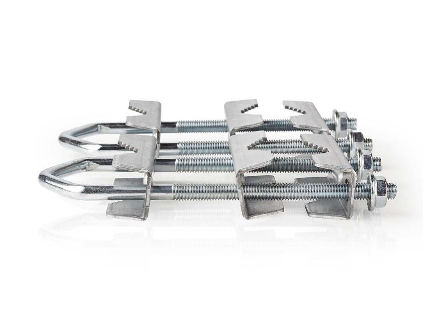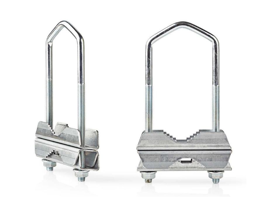 Sæt med to dobbelte klemmebeslag til fastgørelse af mast til altan. Tekniske detaljer: Farve: Sølv Materiale: Galvanseret stål Afstand til monteringshul: 70mm Afstand til væg: 100mm Diameterområde: Ø40... Se mere