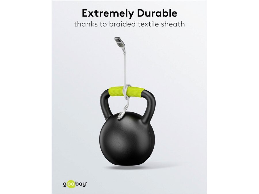 - Det flettede tekstilcover på Goobay USB-A ladekablet er behageligt at røre ved og skånsomt mod følsomme overflader