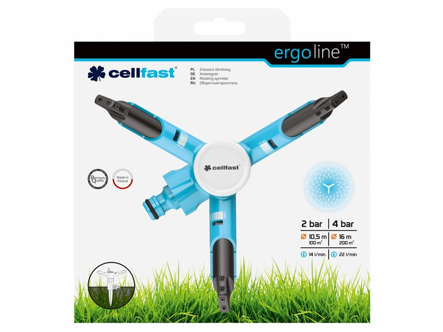 Egenskaber: ergonomisk roterende sprinkler ERGO med jordspyd tre-arm roterende sprinkler, 12 dysehuller Dækning op til 200 m² Jøvn vanding af det overrislede område på grund af et nøjagtig... Se mere