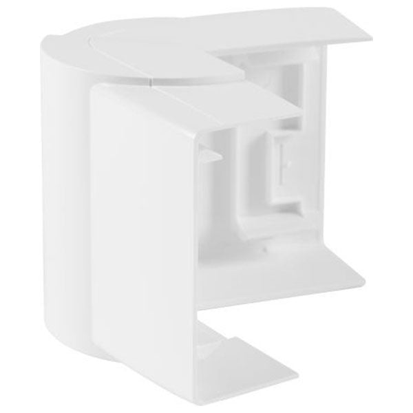 Udvendigt flexibelt hjørne for kanal type LF40060. Flexible formstykker kan justeres med plus/minus 7 grader. Formstykkerne monteres efter at kanalen er sat op, og dækker overskæringerne af kanalbunden.