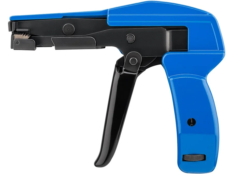 2-i-1-værktøj til hurtig opstramning og afklipning af kabelbindere i blot ét trin. Praktisk værktøj til elektrikere, industri og håndværk. Egenskaber: Spændingsjusteringshjulet på håndtaget muliggør fleksibel og nem indstilling Når den ønskede spændingskraft er nået, afskærer tangen automatisk det fremspringende materiale fra kabelbinderen. Den lette vægt og den ergonomiske form muliggør komfortabel betjening med én hånd. Lavet af robust metal Tekniske detaljer: Farve: blå, sort Materiale: plastik, stål Kabelstrip breddde: 2,2...4,8mm Vægt: 355g