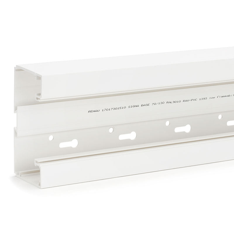 Installationskanal af kunststof. Løser mange installationsproblemer. Moderne softline-design. Montagefordele som bundlokning og DIN-skinne i bunden af kanalen.