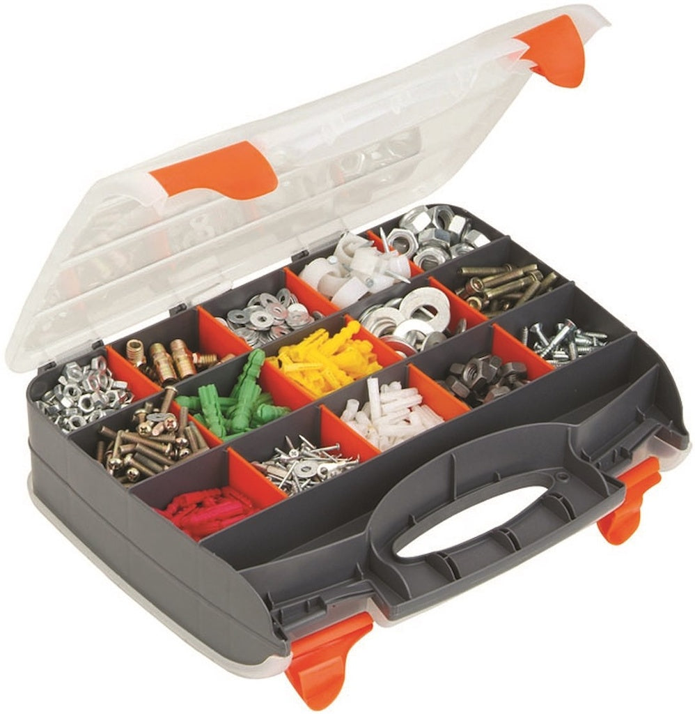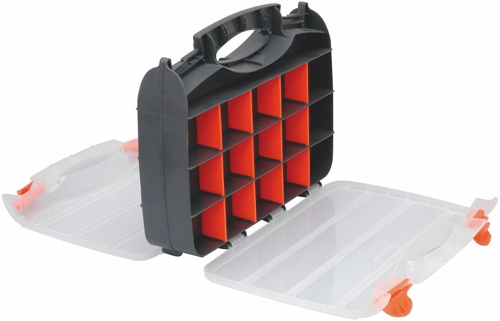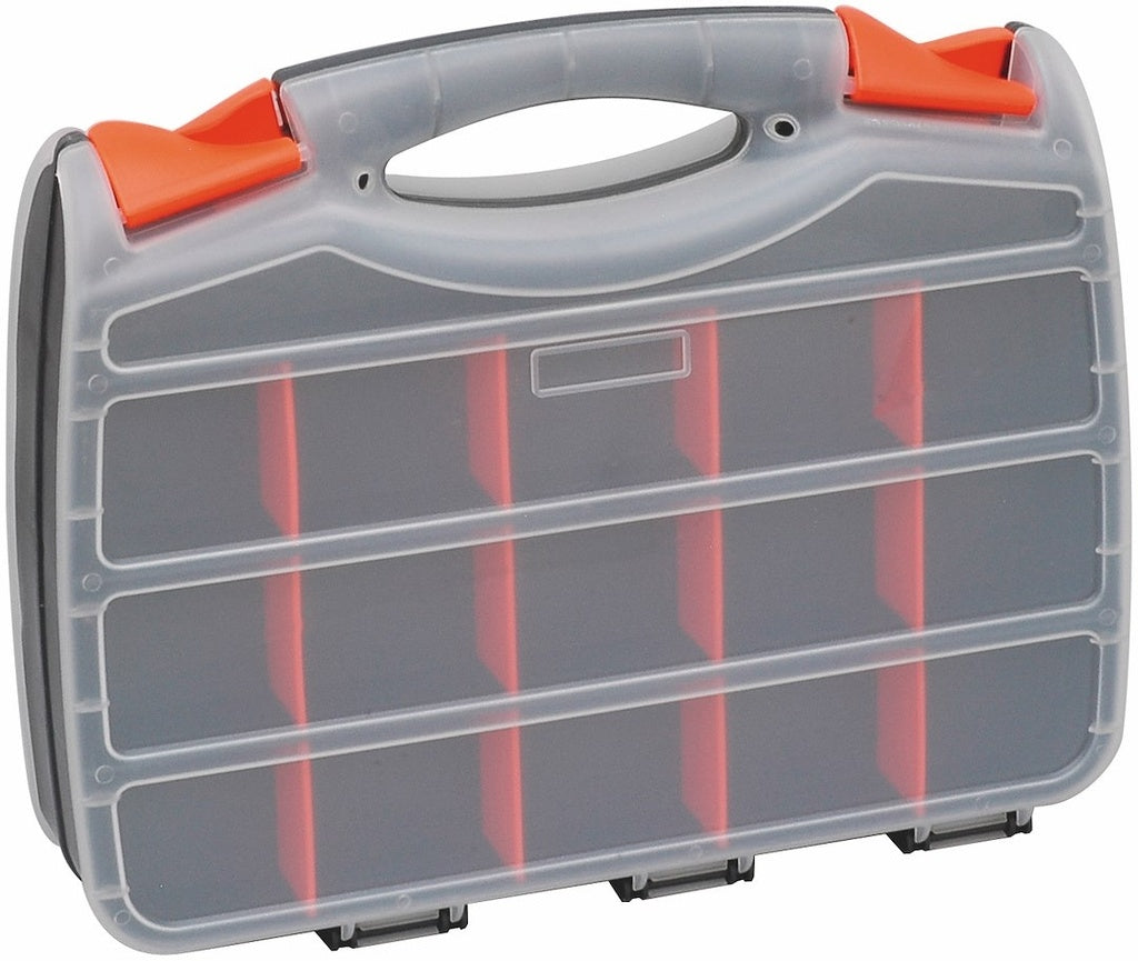 Dobbeltsidet opbevaringskasse af plast. Transperent låg med hurtiglås. Håndtag og flytbare mellemvægge. Fag: 32 stk.Mål (BxHxD): 320x260x80 mmVægt: 0,7 kg