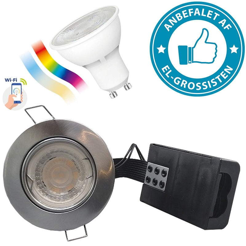 PRO INDBYGNINGSSPOT INCL. 5W RGBW DÆMPBAR og WI-FI LED PÆRE Super flot downlight LED spot med front-design i børstet der vil passe ind i ethvert dansk hjem. Denne indbygningsspot er et virkeligt go... Se mere