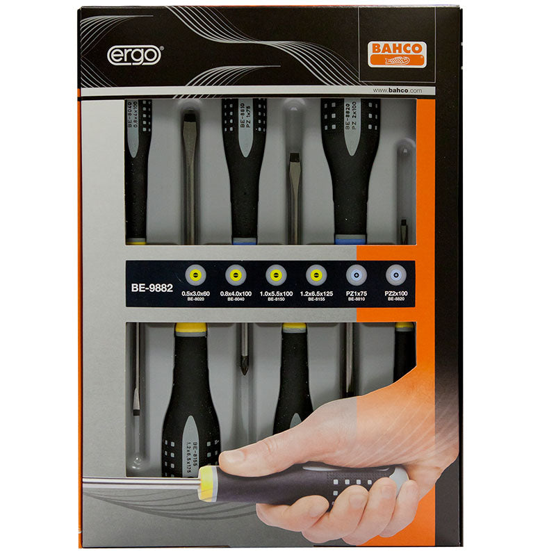 4 stk. lige og 2 stk. Pozidriv®-kærv. Ergonomisk 3-komponentgreb. Permanent farvekode i begge ender af skaftet til hurtig identifikation af type.