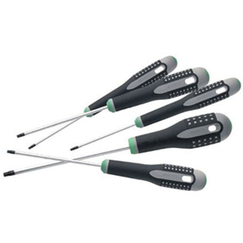 Skruetrækkersæt fra Bacho med ERGO™ håndtag, der sikrer et godt greb og komfort under arbejdet. Sættet indeholder fem forskellige TORX® skruetrækkere, som dækker størrelserne T10, T15, T20, T25 og T30.