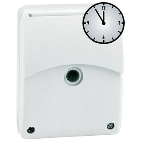 ESYLUX udvendig monteret skumringsrelæ med tænd- og slukur. Integreret tænd- og slukur. LED-indstillingshjælp. Dobbelt ledningsindføring.